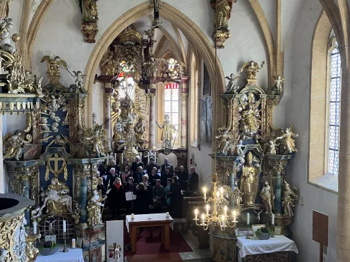 Am zweiten Sonntag also traf man sich in der Kirche zu St. Kosmas und Damian (erste urkundliche Erwähnung 1277), wo um kurz vor 10 Uhr vormittags zur Ankunft der Pilger vom Mesner soz. zusammengeläutet wurde. Dazu muss der – und das ist das Besondere an dieser Kirche – den Glockenturm besteigen, um das Geläute in Gang zu bringen. Nach der einmaligen Umrundung der Kirche und dem Einzug in die Kirche wurde die Messe von Pfarrer John Opara und Diakon Josef Lagler gelesen und vom Singkreis mit sehr viel Gefühl und entsprechender Religiosität musikalisch umrahmt.